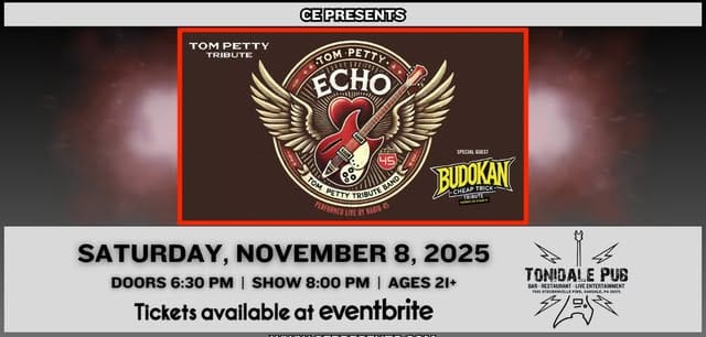 Nov 8 Echo – Tome Petty Tribute wsg Budokan Cheap Trick Tribute 8:00 pm - 11:00 pm Budokan Cheap Trick Tribute The Tonidale Pub 7001 Steubenville Pike, Oakdale, PA Event Details Get Directions