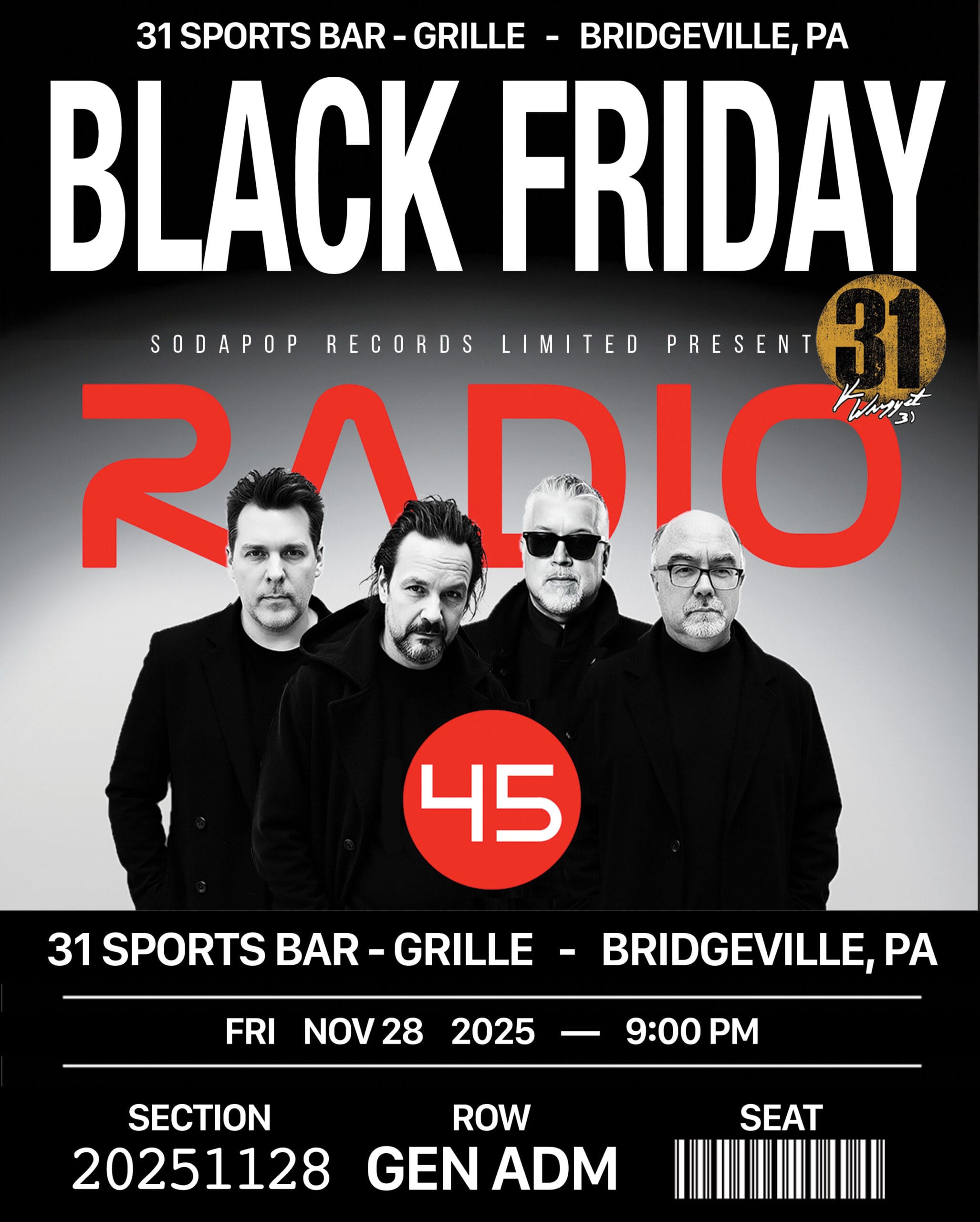 Nov 28 Radio 45’s BLACK FRIDAY Event 8:00 pm - 11:00 pm Radio 45 31 Sports Bar - Grille 1020 Washington Pike, Bridgeville Event Details Get Directions