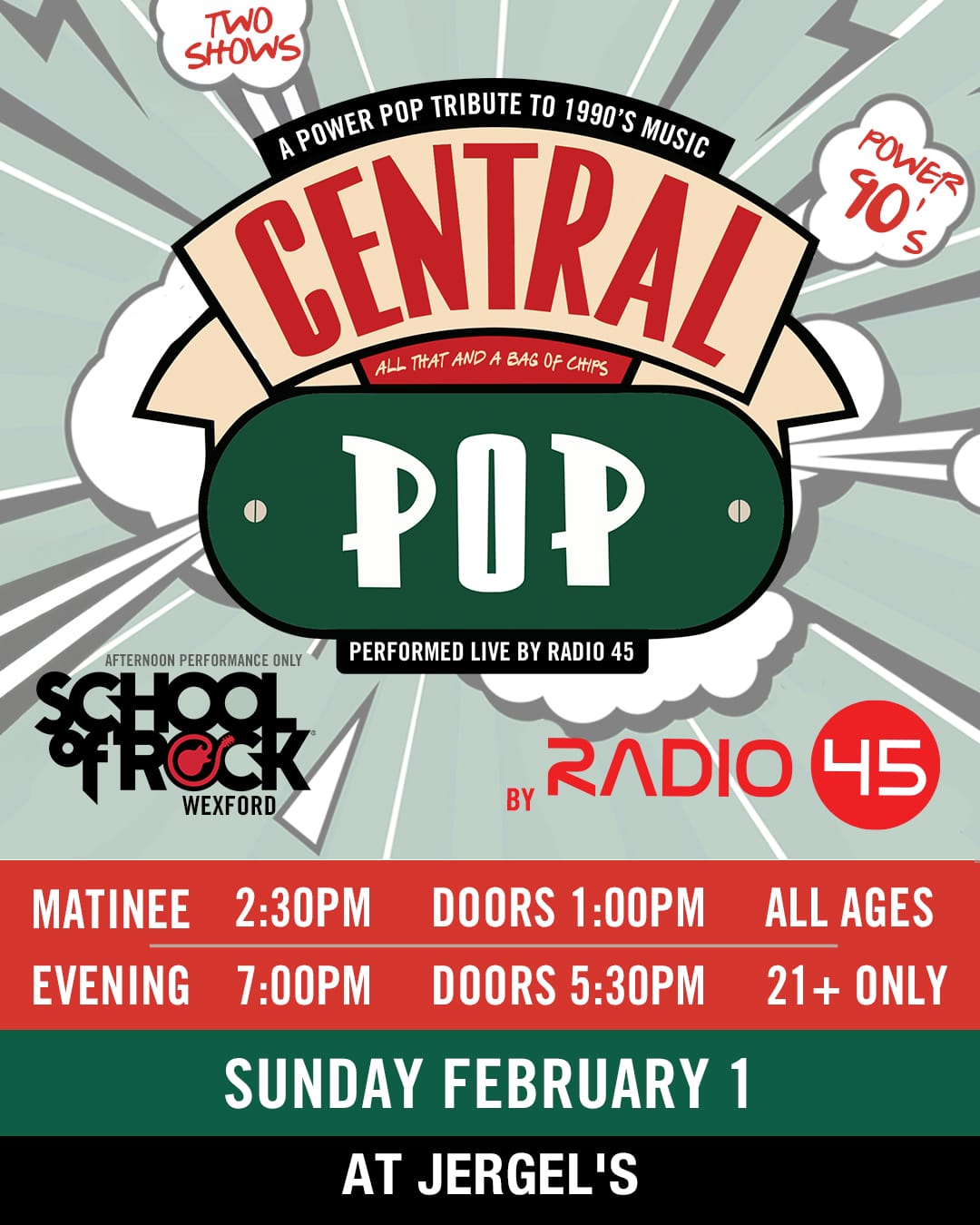 Feb 1 Central Pop: a Power Tribute to 1990’s Music wsg The School of Rock 1:00 pm - 10:00 pm Central Pop Power Tribute to 90's Music Jergel's Rhythm Grille 103 Slade Ln, Warrendale Event Details Get Directions